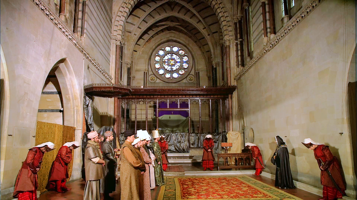 Час настал! Мурад Султан задумал коварный план. Он передаёт клинок правящей династии османов одному из рыцарей Родосской крепости. Клинок должен попасть в руки священника Поля. Нам показывают Султана Сулеймана с пашами в церкви Родоса. Обратите внимание, паркет уже накрыт османским ковром. Падишах обращается к самому старенькому паше: "Помню, Вы мечтали совершить здесь намаз, час настал!" Тот паша готов был умереть в походе, но увидеть победу Османской империи на Родосе. В это же время в султанском дворце молятся женщины падишаха. Они все собрались в покоях матери Сулеймана, Валиде. Внезапно у фаворитки падишаха, Хюррем, начинаются роды. Она до последнего молчала, терпела. И вдруг как закричит! Хатидже вся сгибается над Хюррем. Она буквально опускается на колени перед рыжей наложницей. Валиде тут же вскакивает. Она приказывает помочь Хюррем. Служанки сбегаются на помощь. Хюррем с трудом может идти. Кадры с кричащей Хюррем чередуются с напряженной сценой в Родосской церкви. И у Хюррем,