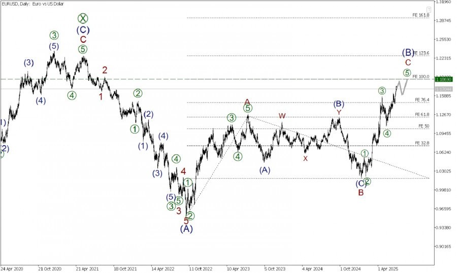 https://basechop.ru/wordpress/?p=48405 Рынок по Евродоллару в долгосрочной перспективе может формировать крупную бычью коррекция (B), которая принимает форму стандартного зигзага A-B-C. На сегодняшний день полностью завершены только первые две его части – импульс A и коррекция B. На последнем участке графика мы можем наблюдать развитие бычьей волны C, которая, по всей видимости, принимает форму импульса. На текущий момент завершены первые четыре его части – подволны [1]-[2]-[3]-[4]. В процессе построения ,бычья финальная подволна [5]. Большая вероятность, что быки внутри волны [5] смогут отправить рынок в область уровня 1.186. На указанной отметке величина крупной импульсной волны C составит 100% по расширению Фибоначчи от предыдущей импульсной волны A. Таким образом, при продолжении роста, стоит рассмотреть открытие длинных позиций с текущего уровня, с целью забрать прибыль на указанной отметке. После достижения уровня 1.186, ожидается смена тренда, а именно ожидается развитие…