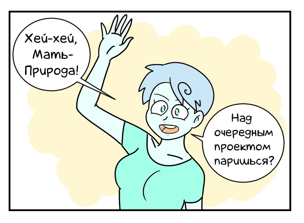 Однажды, мне пришла в голову идея изобразить Природу и Эволюцию в виде двух подруг, которые создают новые виды животных. И если Мать-Природа по характеру получилась более консервативная и рассудительная, то Эволюция вечно придумывает что-то новое и устраивает кипиш. Впрочем, в первом эпизоде их характеры ещё не были до конца проработаны. В дальнейшем, проказы Эволюции стали более явными. Природе еще не раз предстояло иметь дело с последствиями шуточек Эволюции. Во втором эпизоде Мать-Природа немного сменила имидж. В третьем эпизоде раскрывается процесс создания нового вида животных. Впрочем, некоторые считают, что лучше бы и не раскрывался... Впрочем, не беспокойтесь - пингвины вполне себе неплохо себя чувствуют в Антарктиде, всё-таки Эволюция знала, что делала. В четвёртом эпизоде, Природе и Эволюции пришлось заново восстанавливать человечество. Тут уже отожгла Мать-Природа, да так что Эволюция ещё долго не могла забыть увиденное... А на сегодня всё, если вам понравились комиксы про П