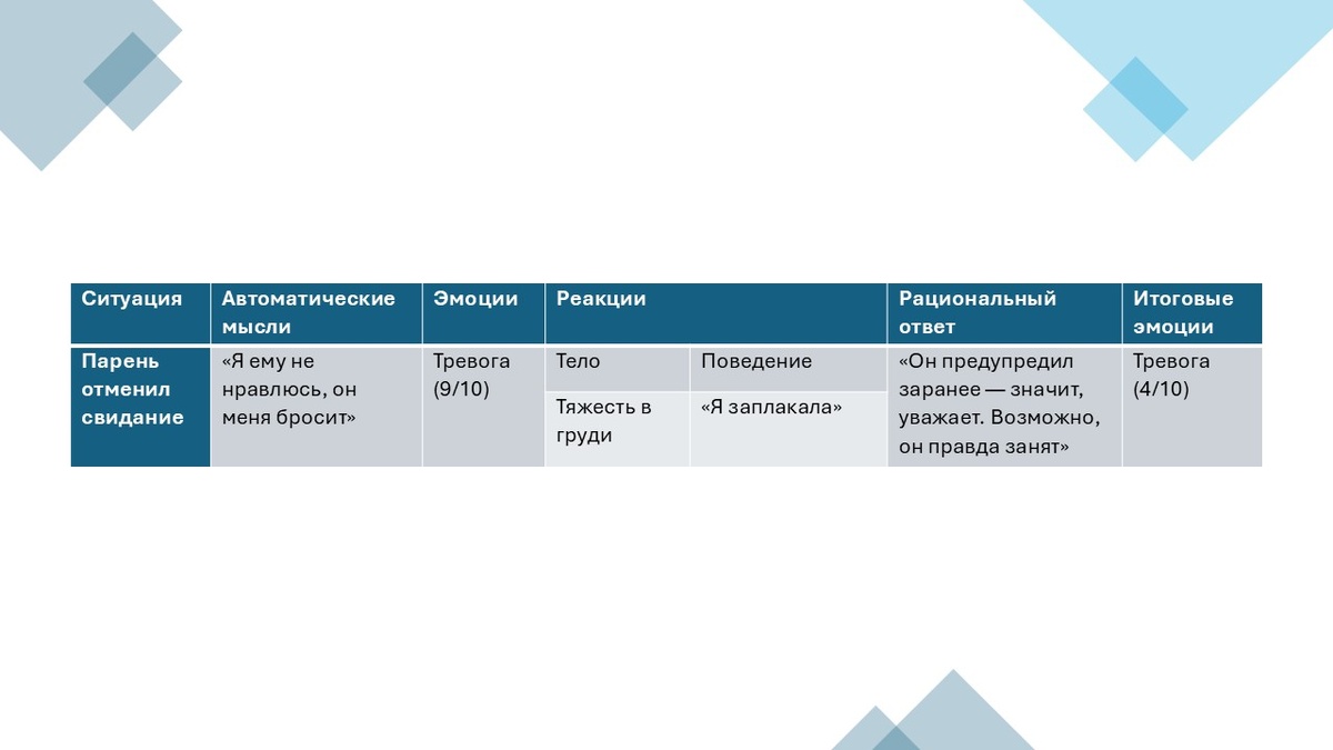 - Когнитивная часть: Выявление и изменение автоматических мыслей (например, «Я провалюсь» → «Я подготовился»).