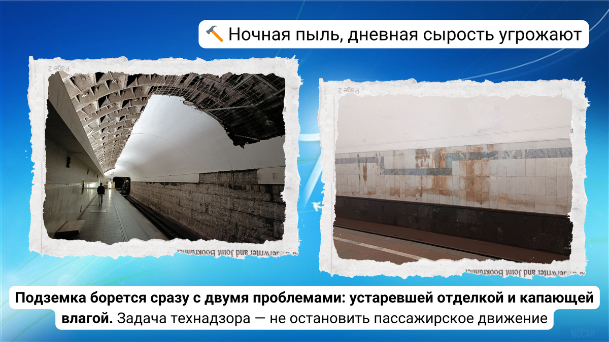 официальные отчеты. Давайте вместе разберемся, что же на самом деле происходит с нашей Москвой. Поехали? Во-первых, хотим сообщить, что в южном зале 🚇 станции «Третьяковская» в ночные окна продолжаются работы по демонтажу отделки на своде 📷 1.1-1.4: Путь Калининской линии в сторону «Новокосино». 📷 1.5-1.10: Путь Калужско-Рижской линии в сторону «Медведково». Окончание работ по-прежнему планируется в I квартале 2026 года. Проведение каких работ запланировано: https://vk.com/wall-150643822_341314 Во-вторых, оценим ☔ водопроявления на путевой стене 🚇 станции «Чис