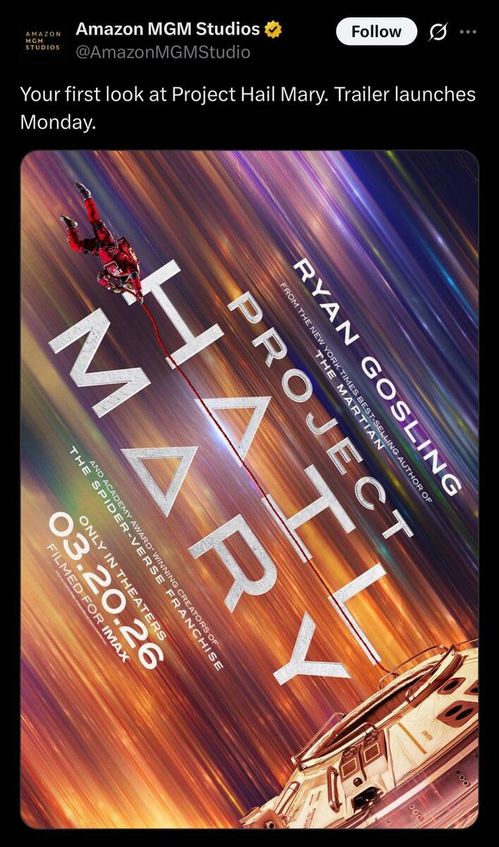 Аве Мария (2026) Когда учитель естественных наук Райланд Грейс просыпается на борту космического корабля — один, без памяти и за миллионы километров от Земли — вскоре он понимает, что он не просто астронавт, он последняя надежда человечества. Итак! У нас горячая новость — MGM опубликовала в своих соцсетях первый постер экранизации фантастического книжного бестселлера «Аве Мария». И да, это отличный повод немного поговорить о нём. Начну с того, что «Аве Мария» — одна из моих любимых книг. С тех пор как я её прочитал, а это было в 2021 году(в год релиза) — я ждал экранизации. Тем более, уже тогда ходили слухи что MGM выкупила права на книгу за $3 млн. Теперь представьте мой шок и трепет, когда два абсюлютно лютых и крутейших режиссера Фил Лорд и Кристофер Миллер (авторы «Мачо и Ботана», «Души», «Лего-муви» и шикарного «Человека-паука: через вселенные») взялись за экранизацию. Отмечу что ради этого фильма, их режиссёрский дуэт возвращается к большому кино, впервые с 2014-го. Дальше кр