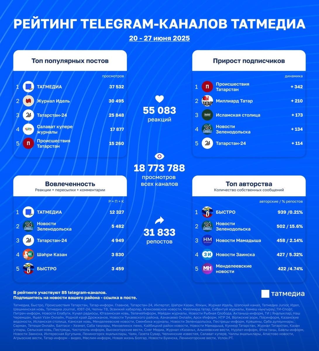 В ответ на пост 📈📱Статистика каналов Татмедиа на уходящей неделе | 20-27 июня Каналы с наибольшим числом просмотров: 1. ТАТМЕДИА - 2 958 610 2. Новости Зеленодольска - 1 079 209 3. БЫСТРО - 998 172 4. Татарстан-24 - 817 626 5. НТР-24 - 710 136 Посты с наибольшим числом просмотров: 37 532 🔹 ТАТМЕДИА: Рустам Минниханов и Марат Хуснуллин прибыли на Сабантуй в Мирный. 30 495 🔹 Журнал Идель: Артисты сцены ИDЕЛ ждут тебя на VK Fest 29 июня у Центра семьи «Казан». 25 848 🔹 Татарстан-24: Минниханов дал старт строительству высокотехнологичного завода. 17 877 🔹 Салават купере журналы: САЛАВАTik БАЛАЛАР СТУДИЯСЕНӘ КАСТИНГ. 15 260 🔹 Происшествия Татарстан: Жители Казани сообщают о хлопках в городе. 14 991 🔹 Миллиард Татар: Минниханов и Гойта обсудили сотрудничество Татарстана и Мали. 9 462 🔹 Татар-информ. Главное: В Елабуге отменили фестиваль Березовского и Спасскую ярмарку после атаки беспилотников в середине июня. 8 216 🔹 ТИ-Спорт: В Иннополисе стартовал чемпионат России по