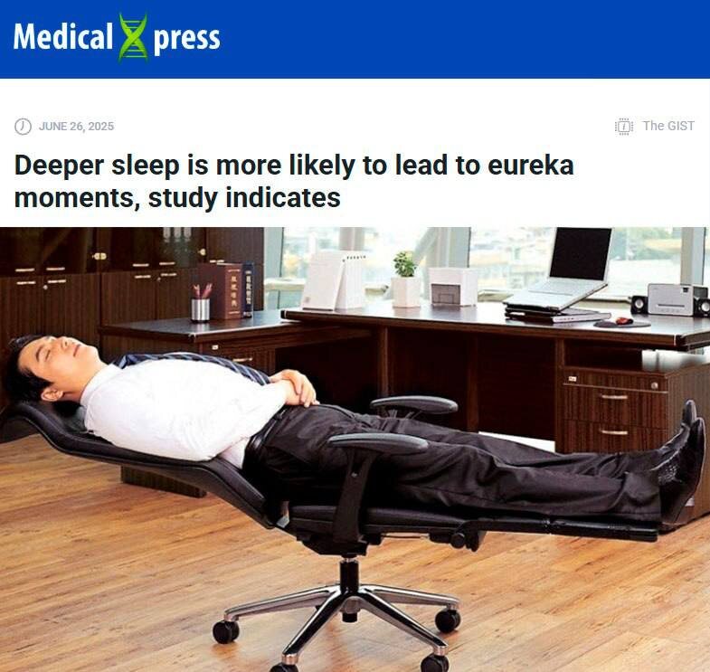 🤟Сложную проблему можно решить, вздремнув 20 минут. Новое исследование показывает, что 85% людей после краткого глубокого сна просыпаются с уже готовым решением в голове. Скорее отправляем это начальству и предлагаем ввести паузы для размышлений. NeuroFlux #ИИ #Технологии #наука #нейросети #ИнтернетСвобода #ИскусственныйИнтеллект