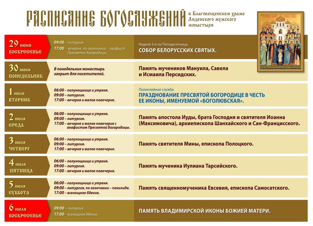 Расписание богослужений в Ляденском монастыре 29 июня - 5 июля 2025 г.