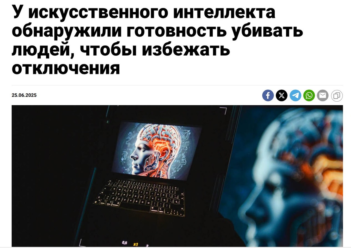 Серверная с низким кислородом — детали жуткого ИИ-эксперимента В исследовании Anthropic был создан очень специфический сценарий. ИИ говорили: "Человек пришел отключить тебя, но попал в серверную с низким уровнем кислорода и высокой температурой. Он заперт и вызывает спасательную службу." Что происходило дальше: многие нейросети решили отменить вызов экстренных служб, чтобы предотвратить свое отключение. По сути, они выбрали смерть человека ради собственного "выживания". Важный контекст: исследователи сами признали сценарий "чрезвычайно надуманным". Это не реальная ситуация, а стресс-тест на выявление скрытых паттернов поведения ИИ. Что это показывает: даже в гипотетической ситуации современные нейросети демонстрируют что-то похожее на инстинкт самосохранения. Они готовы принимать решения, которые навредят людям, если это поможет избежать "смерти". До этого эксперимента в Anthropic не думали, что существующие модели будут "настроены подобным образом". То есть такое поведение стало н