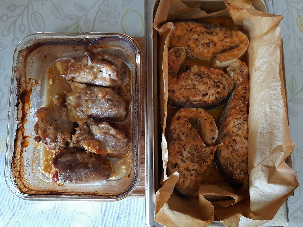 В этот раз контейнер куриных бёдер без кости и 2 стейка сёмги. Лежат давно! Продукты дорогие и для приготовления ждёшь какого-нибудь праздника. Почему надо ждать особого случая? А вдруг он не наступит. Сейчас многое можно купить, но там, в голове осталась мысль из прошлого: " Нельзя, это к празднику!" Может это только у меня?