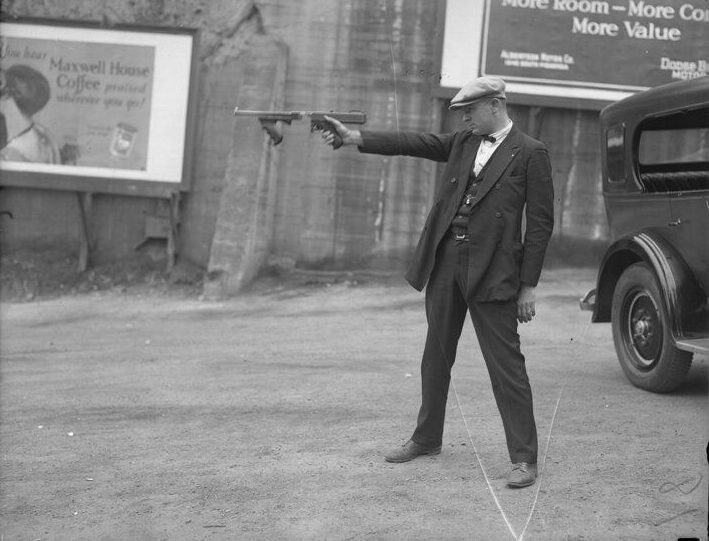 В 1925 году детектив Оскар Бауэр позировал для фотографа с Томпсоном в руках — грозным оружием того времени. Без магазина, правда, но это не мешало ему выглядеть как герой нуара. Вместе с коллегами он олицетворял образ настоящего блюстителя порядка на фоне разгула бутлегерства и мафии.