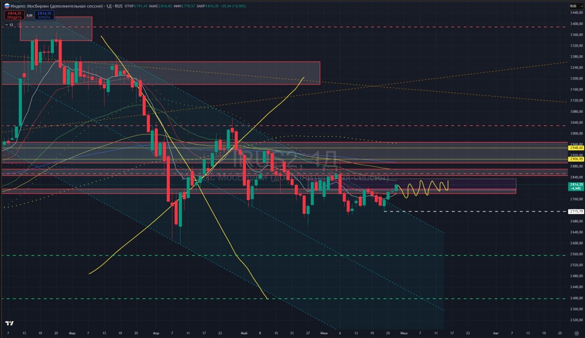 По индексу нисходящий тренд с февраля побит. Роста в самом индексе не жду. Скорее всего просто будет запиливаться в боковике. Пока мы не уйдем ниже 2715, смысла думать о среднесрочном снижении - нет.