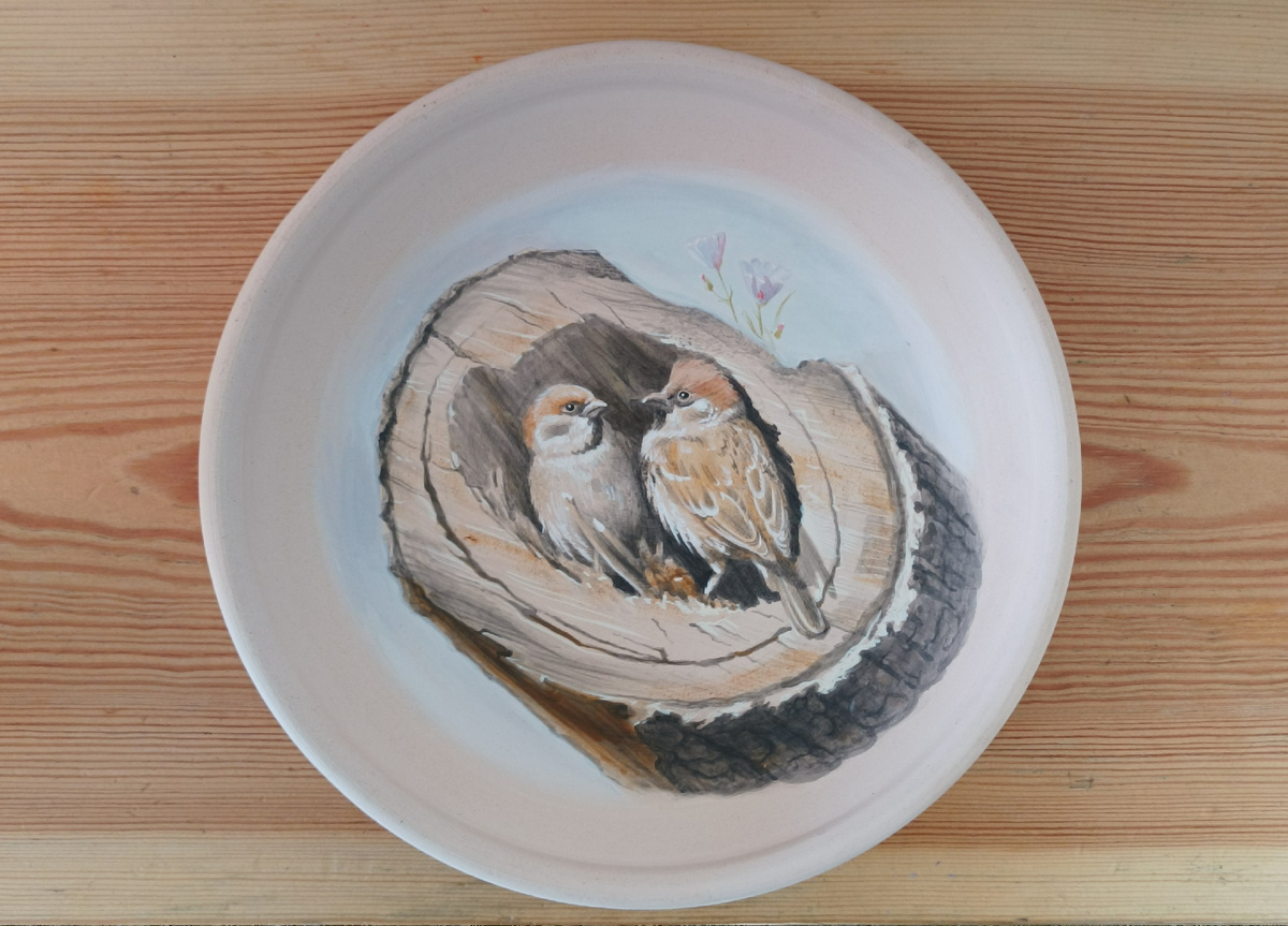 Воробей и воробьиха. -Чив! - сказала воробьиха, -Чив! - ответил воробей. -Посидим - ка, лучше тихо в кроне старых тополей. Мир зловреден, ненароком кто услышит наше "чив!" и погубит раньше срока. Лучше, всё же, помолчи. Воробей чирикнул с лаской: - Мир прекрасен, милый друг, не смотри на всё с опаской, подивись на солнца круг. В этот тёплый день и томный разве можно промолчать? О любви своей огромной, ах, как хочется кричать! Автор стихов - Лидия Дунай. Тарелочка расписана мной в технике темпера.