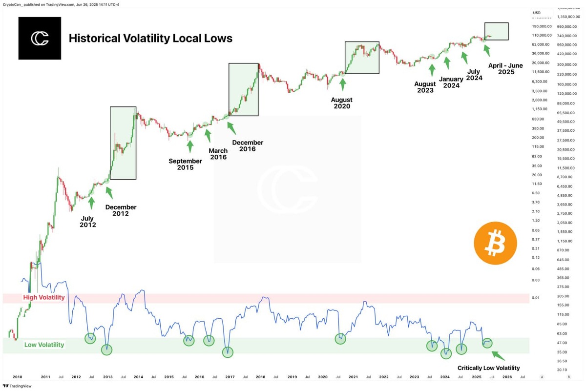 Интересное наблюдение. Волатильность по биткоину сейчас на исторических минимумах. Такие уровни мы видели всего несколько раз за последние 10+ лет. И каждый раз — это было перед финальным рывком рынка вверх. 📉 Волатильность на дне. 📈 Рынок не получает резких движений. История показывает: именно после таких периодов всегда приходил мощный рост. Ни одного медвежьего сценария на таких значениях волатильности не было. Это не гарант роста, но игнорировать это точно не нужно. Что думаете об этом?