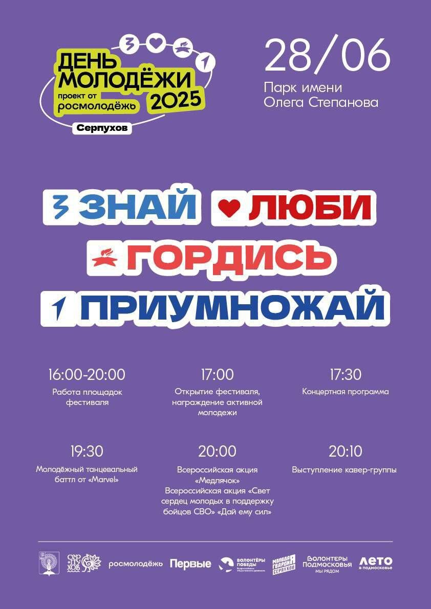 Уже завтра 🔥🔥🔥 Масштабное празднование Дня молодёжи пройдёт в парке имени Олега Степанова 🌟 Начало в 16:00 Подробнее - в афише ✅ Приходите всей семьёй! 0+