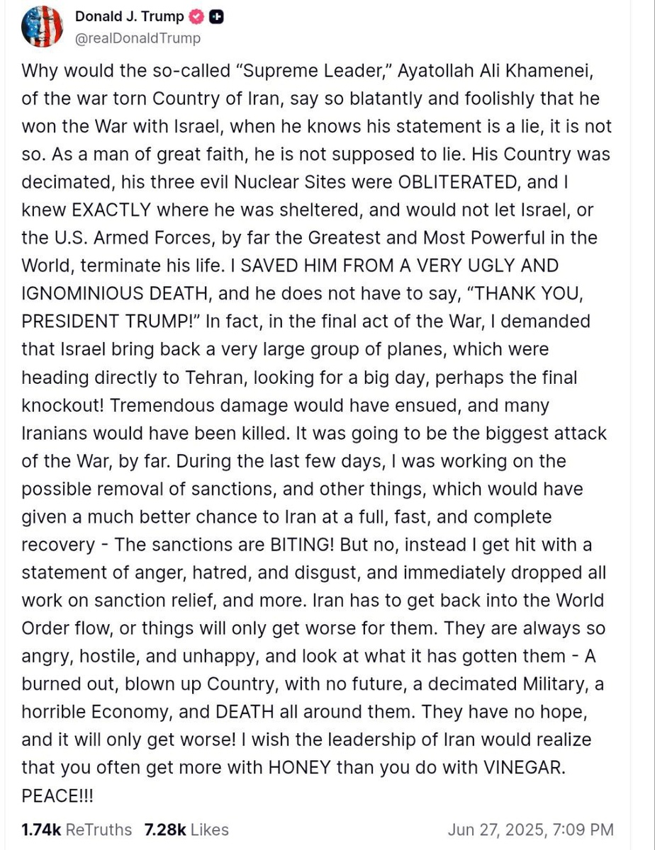 Трамп прекратил работу над смягчением санкций против Ирана после заявлений аятоллы Хаменеи. «Почему так называемый «Верховный лидер» – аятолла Али Хаменеи, руководитель раздираемой войной страны Иран, – так откровенно и глупо заявляет, что выиграл войну с Израилем, хотя сам прекрасно знает, что это ложь, это не так. Как человек глубокой веры, он не должен лгать. Его страна была разрушена, три его злонамеренных ядерных объекта – уничтожены, и я точно знал, где он укрывался, но не позволил Израилю или Вооружённым силам США – безусловно, самым великим и мощным в мире – ликвидировать его. Я спас его от очень уродливой и позорной смерти, и ему даже не нужно говорить: «Спасибо, президент Трамп!»», – написал президент США в Х. Трамп заявил, что после слов Хаменеи о победе Ирана он решил не ослаблять санкции для Ирана. «В последние дни я работал над возможным снятием санкций и другими шагами, которые могли бы дать Ирану шанс на быстрое, полное и успешное восстановление – санкции действитель