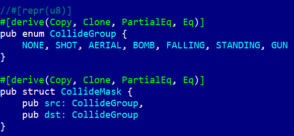 Обратим внимание на многочисленные #[derive]. Без них, оказывается, эти данные ни копировать, ни даже сравнивать между собой нельзя. Также, я закомментировал #[repr(u8)]. Это указание, что enum-тип должен иметь размер 8 бит, но Rust определяет это автоматически.