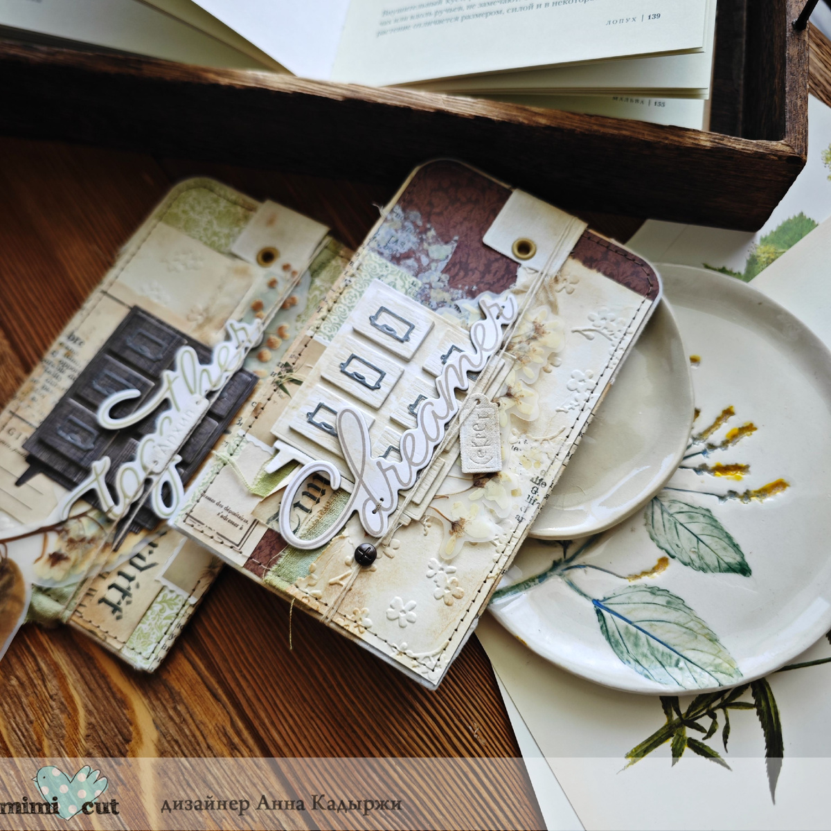 Пожалуй самая редкая форма в моём исполнение это - теги. Но, даже если берусь за них, то это классические формы, без лишних углов. Выразительные и статные, пусть всё внимание уходит внутрь объекта, а не на его форму. А отправлением для начала работы с этой формой стал маленький тег из набора "В спичечном коробке", который так классно можно завернуть как держатель большого тега. Далее мой взор приковал нож "Картотека". Считаю он вполне может быть одним из основных объектов в работе и закрутить тему коллекционирования. Например, коллекционирования гербария. Вот так шаг за шагом и складывается моя работа, в которой каждый элемент тянется из другого. Оставалось достать тот самый гербарий, замотать композицию нитью для прошивания архивов, добавить скрепки, скобы и милые бирки. Всем вдохновения, ваша Анна Кадырджи.