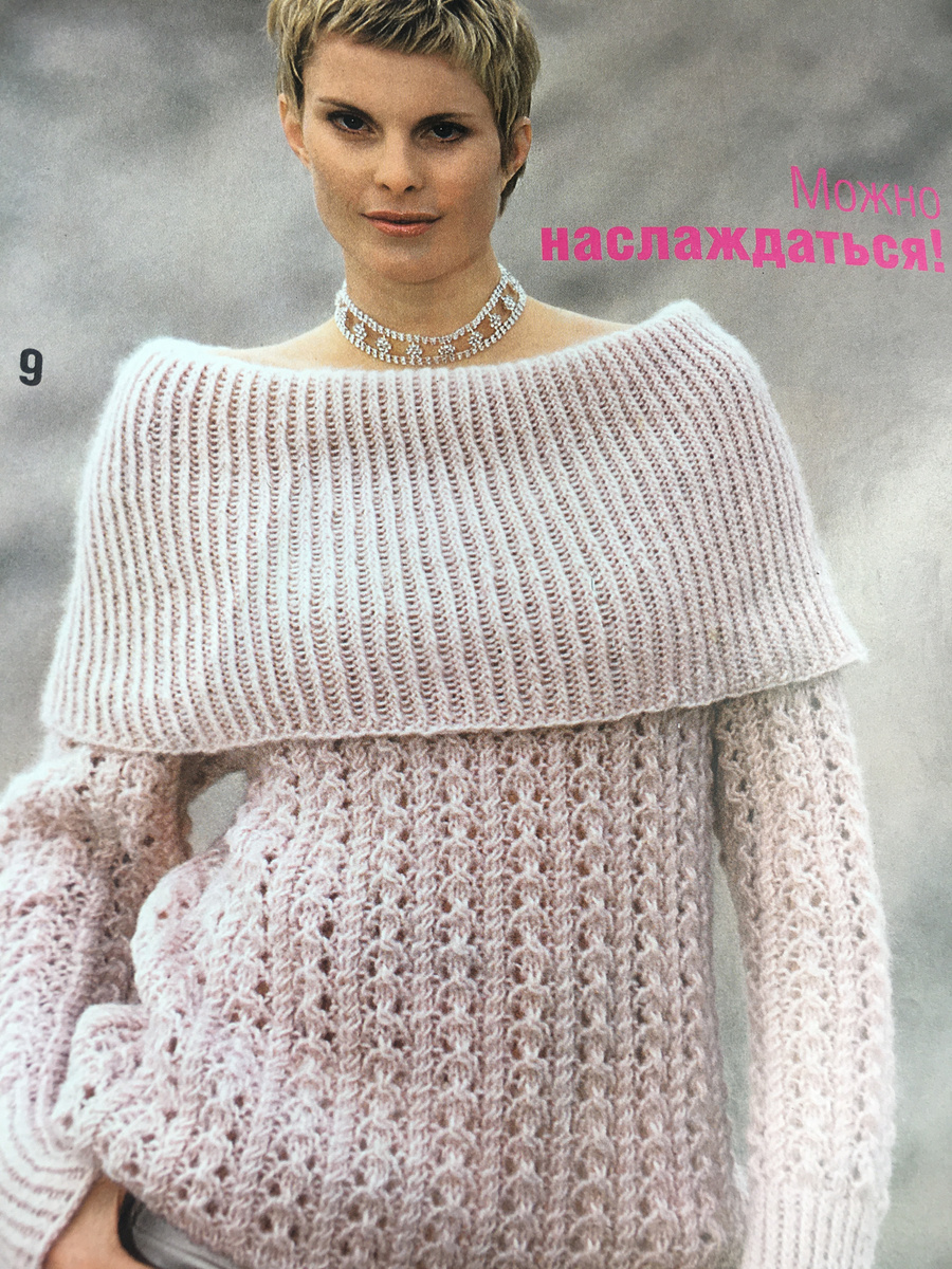 Не раз убеждалась в том, что многое зависит не от сложности узора, а оттого как узор сочетается с качеством пряжи. С разной пряжей Вы можете получить совсем другой эффект. Она может порадовать Вас в изделии или наоборот огорчить. Вот в этой модели все сошлось : и дизайн, и узор, и качество пряжи. Модель просто идеальна и просто проста в исполнении. Ее может освоить даже начинающая вязальщица и этим она дополнительно привлекательна. Она была предложена в журнале «Вязание. Ваше хобби» № 8 / 2006 и на мой взгляд не потеряла своей актуальности и на сегодняшний день. Действительно изделием "можно наслаждаться" как отметили авторы. В вязаном полотне использовано лишь перекрещивание двух петель между собой в одинаковом направлении, два накида для ажура с уменьшением трех петель в одну или с протяжкой, как указано в схеме. Изделие вяжется снизу от высокой резинки, где петли идут попеременно 1лц, 1 из … (можно скрещенными лицевыми петлями) вверх до большого воротника-пелеринки. Такой вор