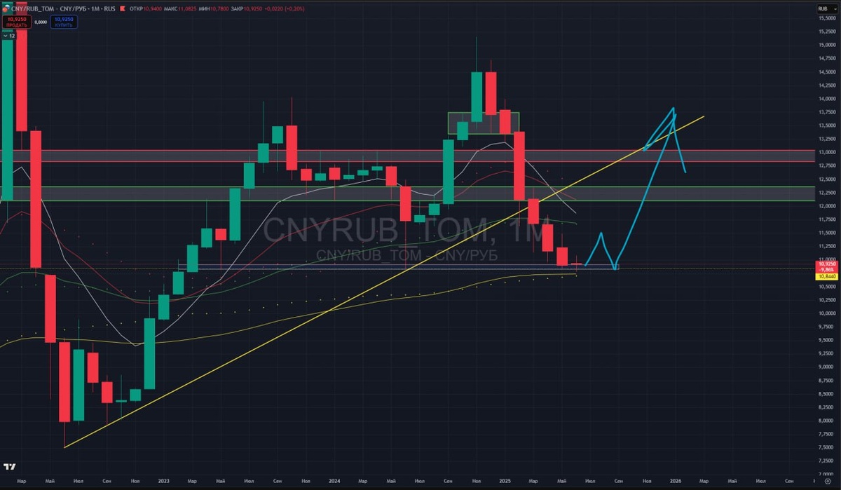 #юань #доллар #валюта 💱 По валюте завершается седьмой месяц снижения. Это уже достаточно, чтобы начать формировать дно. V-образных разворотов после таких падений не бывает, поэтому ближайшие 2–3 месяца — это, скорее всего, волатильный боковик с возможным ещё одним заходом вниз — и только потом тренд вверх. 📊 В базовом сценарии — ниже сильно не пойдём, только если не случится что-то экстраординарное. Текущие уровни считаю справедливыми: — всё, что ниже, — дисконт, подарок покупателю; — всё, что выше, — премия продавцу. 🧠 Рисков тут нет. Логика простая: валюта - это не доля компании, а живые деньги — на неё можно купить товары и услуги. ❗️Инфраструктурные риски выносим за скобки 🎯 Лично я вижу здесь хорошие уровни для формирования долгосрочных позиций. Тем более, что в рамках нашего правового контура достаточно инструментов, с которыми можно работать спокойно и системно.