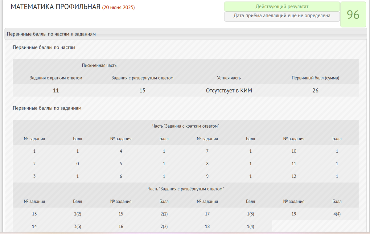Но это только часть беды. Ещё один первичный балл я потерял в первой части - вероятно, решая её целиком за 6 минут, следовало бы ещё перепроверить свою арифметику. При отсутствии ошибки в параметре этот косяк выглядел бы ещё прекраснее - 99 баллов, почти как у одного моего одноклассника в 2010 году (тоже с ошибкой в первой части и полностью верной второй - только тогда это было 97, и это всё равно оставалось лучшим результатом в классе).
