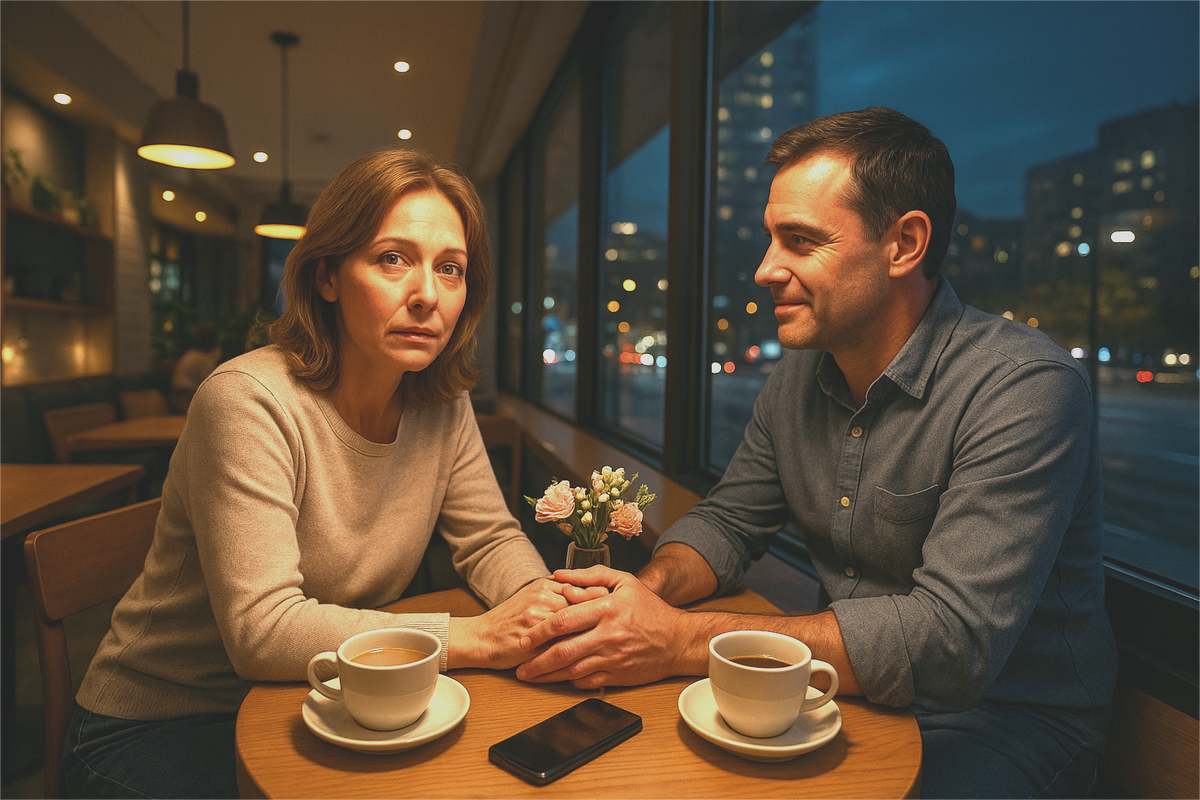 Они сидели в кафе, держась за руки, и говорили обо всём на свете. Без оглядки на чужие мнения, без страха быть неправильными. Просто два человека, которые дают себе второй шанс.