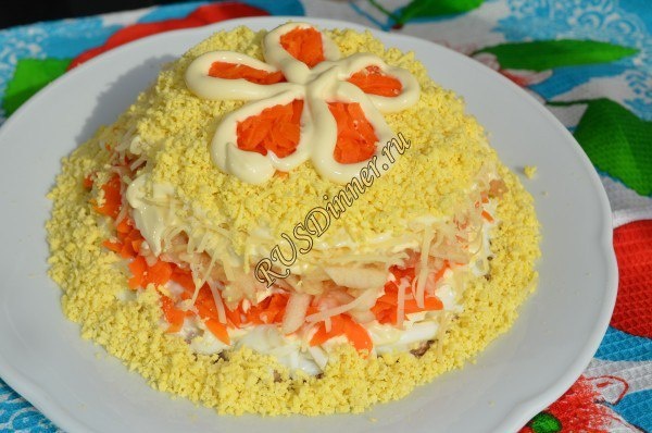 Салат слоеный с яблоком и скумбрией Ингредиенты: Скумбрия консервированная - 1 шт. Морковь - 150 гр. Яйцо - 4 шт. Сыр - 100 гр. Майонез - 150 гр. Яблоки - 150 гр. (кисло–сладкое) Источник: https://rusdinner.ru/page/salat-sloenyj-s-jablokom-i-skumbriej