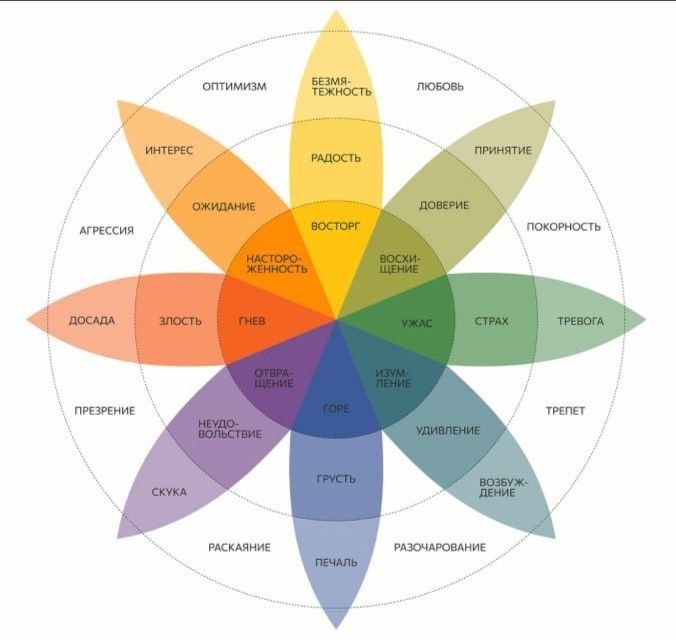 Цветок эмоций: так что же ты чувствуешь? Эмоции — не слабость. Это язык нашей внутренней жизни. (Р. Плутчик) Американский психолог Роберт Плутчик создал одну из самых красивых и понятных моделей эмоций — цветок эмоций (колесо эмоций). На этом "цветке" восемь базовых эмоций расположены, как лепестки: радость, доверие, страх, удивление, грусть, отвращение, гнев и ожидание. Почему именно эти эмоции? Плутчик считал, что базовые эмоции — это фундамент нашего выживания и развития. Каждая из них несет важную эволюционную функцию: страх спасает от опасности, гнев помогает отстаивать границы, радость укрепляет социальные связи. Они универсальны для всех людей, независимо от культуры. Почему форма цветка? Эмоции не существуют в изоляции. Они могут смешиваться, переходить друг в друга. Как цвета на палитре, эмоции образуют сложные оттенки чувств — например, радость + доверие = любовь, страх + удивление = трепет. Цветок позволяет видеть эти переходы и комбинации наглядно. Эмоции, находящиес