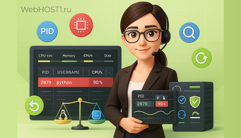 Сервер начал тормозить. Открываете мониторинг — видите, что один процесс нагружает CPU под 90%, но вместо имени — только PID. Что это? Бэкап? Скрипт? Вредонос? Пока вы ищете ответ, сайт уже не отвечает, клиенты жалуются, а SSH лагает. Если вы администрируете VPS или выделенный сервер, нужно уметь быстро находить имя процесса по PID. Рассказываем, как это сделать — и как мы в Webhost1 помогаем решить такие ситуации заранее. Если сервер “грузит” неизвестный процесс — проверьте разбор по Load Average, там объясняем, как найти и устранить проблему. Linux хранит информацию о каждом процессе в файловой системе /proc. Там создаются папки с цифровыми именами — это и есть PID. Например, /proc/1 — это процесс с PID 1, почти всегда это systemd. Проверить содержимое можно командой: ls /proc/1 Название самого процесса хранится в файле comm: cat /proc/1/comm Если вы просто хотите увидеть все активные процессы с их PID и именами, используйте: ps aux Если нужен интерактивный мониторинг: top Или более