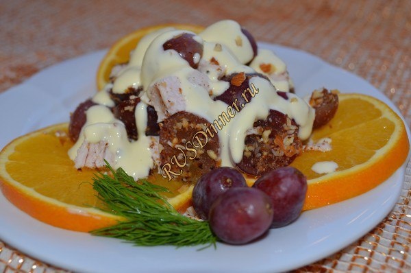 Салат «Соловьёвский» От автора: Не смотря на минимум ингредиентов, салат получается очень вкусным и аппетитным из-за большого количества орехов, и к тому же красивое оформление!!! Ингредиенты: Виноград - 300 гр. (спелый, сладкий) Апельсины - 1000 гр. Куриная грудка - 200 гр. Орехи миндаль - 120 гр. Майонез - 150 гр. Источник: https://rusdinner.ru/page/salat-solovjovskij