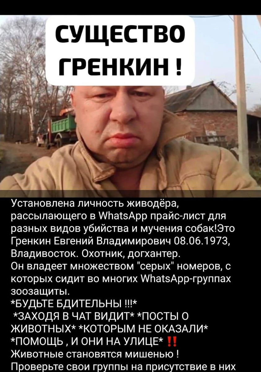 Установлена личность живодёра, рассылающего в WhatsApp прайс-лист для разных видов убийства и мучения собак!Это Гренкин Евгений Владимирович 08.06.1973, Владивосток. Охотник, догхантер. Он владеет множеством "серых" номеров, с которых сидит во многих WhatsApp-группах зоозащиты. *БУДЬТЕ БДИТЕЛЬНЫ !!!* *ЗАХОДЯ В ЧАТ ВИДИТ* *ПОСТЫ О ЖИВОТНЫХ* *КОТОРЫМ НЕ ОКАЗАЛИ* *ПОМОЩЬ , И ОНИ НА УЛИЦЕ* ‼️ Животные становятся мишенью ! Проверьте свои группы на присутствие в них молчаливых "участников" со следующими номерами: 89242565079 89084418968 - это основной номер живодёра Гренкина 89146628421 - частый номер Гренкина 89146628423 89140775569 89619611841 89679262715 89140774245 89143321363 89662816002 89146628398 89084604245 89242655445 89140776878 89147199067 89662816004 89025557960 89242566059 89084602533 89147196097 89242565073 89084602479 89084418968 89064099111 89025557960 89243213897 89243260743 89243205063 89089624286 89089623694 89089623624 89089623621 89089915621 89089926584