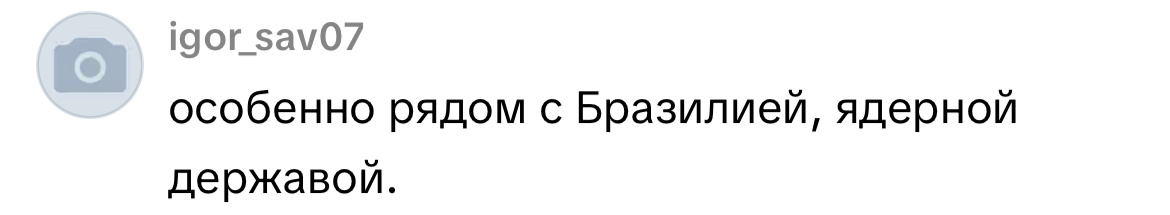 Очередной забавный комментарий я получил )) Это ж надо так далеко быть от реальности! )) В мире всего 5 ядерных держав официально подписавших договор о нераспространении ЯО и еще 4 неофициальных. Это Россия, США, Китай, Франция и Великобритания. А так же Индия, Пакистан, Израиль и Северная Корея. Да, у Израиля 100% тоже есть, хоть они и не признаются. И если вы посмотрите на карту МИРА то увидите где все это располагается и какие территории затрагивает. В свою очередь вся латинская Америка (собирательно, от Кубы и Мексики до Аргентины) является самой большой территорией в мире, официально и юридически свободной от ядерного оружия! Большинство стран здесь официально и добровольно отказалась от размещения, хранения и разработки ядерного оружия. Люди здесь выбрали жизнь и будущее, в отличие от многих куда более «развитых и безопасных» (в кавычках) стран. И если Куба и Мексика еще могут попасть под теоретическую (не дай Бог) раздачу, то Бразилия и уж тем более Аргентина будут максимально
