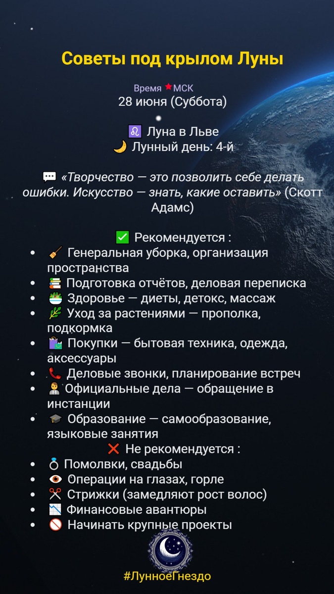 🧘♀️ 28.06.2025 — число дня: 7 «Энергия внутреннего света и поиска истины» Сегодня Вселенная зовёт тебя вглубь — к себе, к своей истинной сути. Число 7 приносит в этот день: ✔️ Глубину мысли и интуиции ✔️ Тягу к знаниям и осмыслению ✔️ Защиту через мудрость ✔️ Силу внутреннего взгляда 💎 Что делать: ✅ Найди время для тишины — медитация или просто моменты уединения принесут ясность ✅ Прислушайся к своему «внутреннему голосу» — он знает ответы ✅ Освободи пространство для духовного роста ⚠️ Осторожно: Не стремись всё контролировать. Сегодня важно доверять внутренней мудрости и позволить событиям раскрываться естественно. 💫 Этот день — идеальное время для вопросов: Кто я? Зачем я здесь? Какова моя истинная цель?