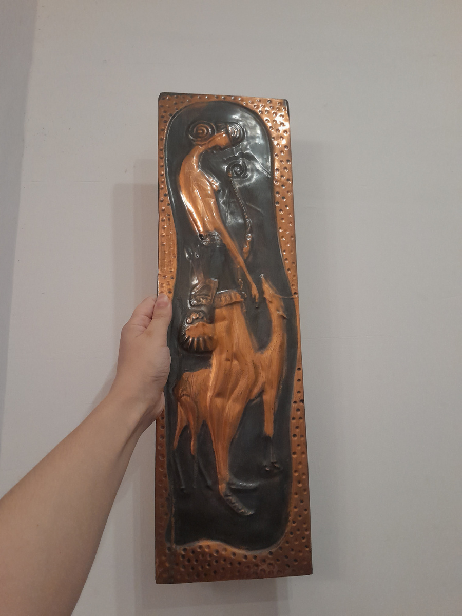 Почта до сих пор закрыта. Вот уже неделя, как там лежат несколько посылок и нас нервируют. Нервничают и продавцы, конечно, тоже - всё ли благополучно доехало. А мы не можем получить посылки - каждый день на двери табличка с новой (о чудо!) датой. Наверное, таблички пишет почтовый барабашка, раз сотрудников нет. Ну а пока почта закрыта, муж съездил к подписчице, забрал посуду и не только, ниже всё покажу. За всё отдали 2500. Вот такая чеканка. Думаю, что это именно медь, красноватый оттенок. Ох, и опять фото в руке. Я вчера и позавчера на дзене не была, а тут меня критиковали, оказывается. Ну так вот. Я никого не спрашивала, как мне фотографировать. Но могу и пояснить для непонятливых. Первое - скорость. Мне за короткий промежуток времени надо сфотографировать большое количество посуды. При этом параллельно я могу делать что угодно - с двойняшками всегда найдётся, что. В руке я могу максимально быстро сфотографировать предмет с разных сторон - сама если что-то покупаю, куплю только