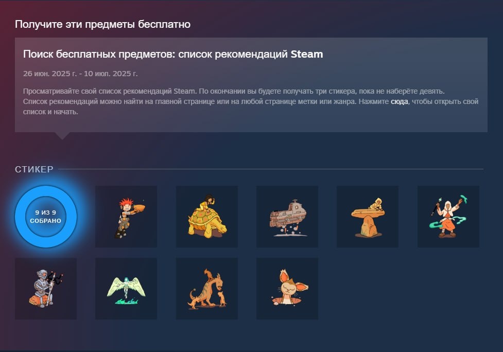 Лутаем: в Steam за просмотр списка рекомендаций вам подарят 9 анимированных стикеров.