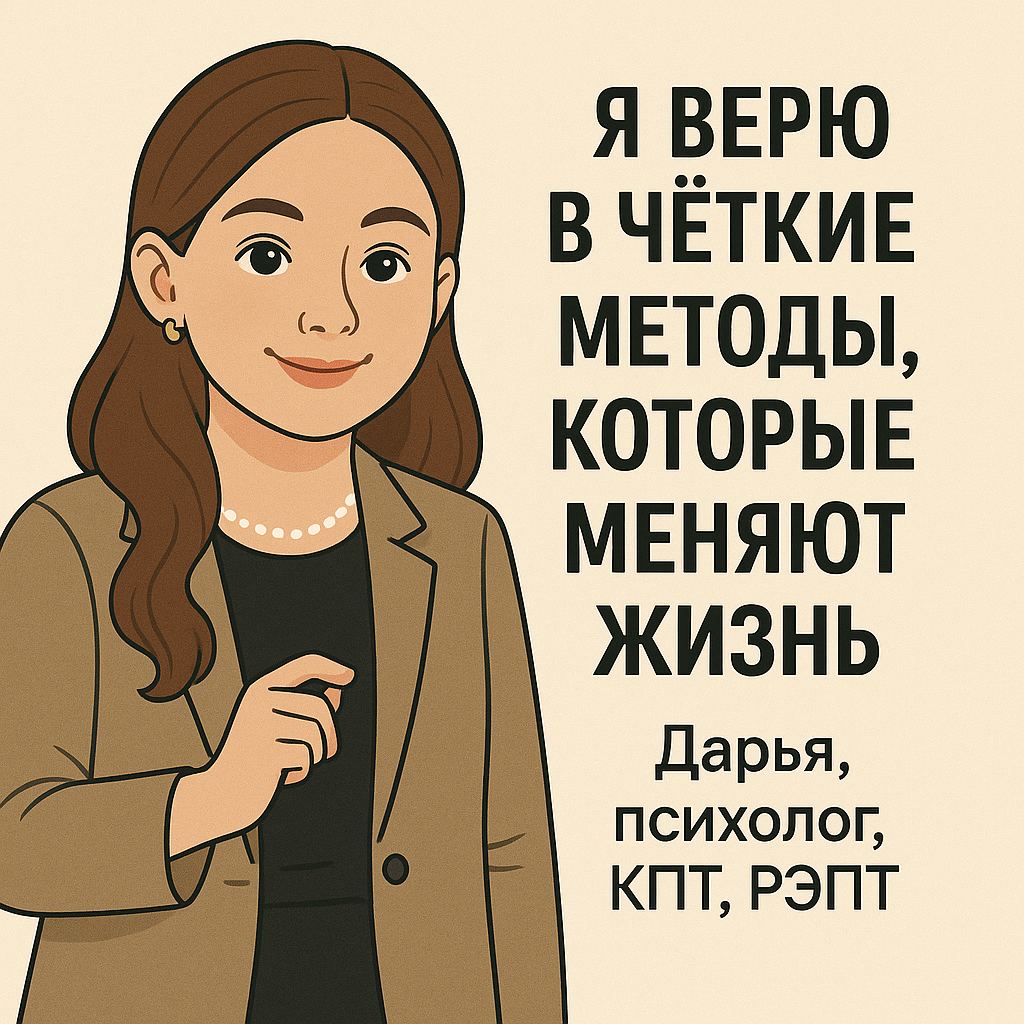 Меня зовут Дарья, я психолог, который работает в КПТ и РЭПТ. Я не верю, что психология — это «просто поговорить». Я верю в чёткие методы, которые меняют жизнь. Если хотите понять, как ваши мысли управляют эмоциями — вы по адресу. Моя главная цель - помочь вам разобраться в мыслях, эмоциях и поступках, чтобы жить более осознанно и свободно. «Возьми себя в руки!», «Думай о хорошем», «Не принимай близко к сердцу» — наверняка вы слышали это миллион раз. Но если бы это работало, разве столько людей страдало бы от тревоги, гнева и выгорания? Я, как психолог, со стороны РЭПТ (рационально-эмотивно-поведенческой терапии), скажу честно: позитивное мышление — это часто просто пластырь на глубокую рану. И вот почему: На простом примере: Ситуация: "Начальник раскритиковал мой отчет по проделанной работе." Убеждение: "На работе меня все презирают, значит я полный неудачник" Проверяем убеждение на реалистичность: - Где доказательства, что меня презирают "все?" - Разве одна ошибка делает меня неудачн