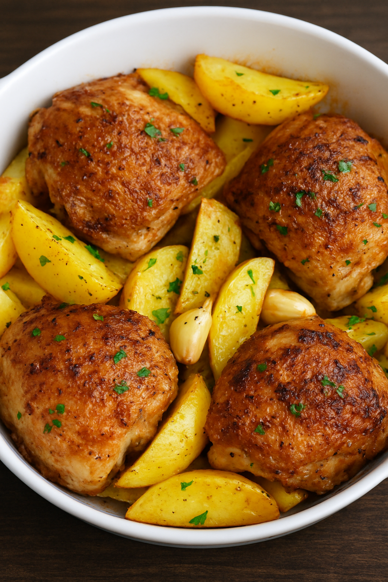 Нежные, сочные куриные бёдра с золотистой корочкой, мягкая картошечка, пропитанная ароматами чеснока и специй — всё это в одной форме для запекания. Идеальное блюдо на вечер: минимальные усилия, максимум вкуса. Просто, вкусно, по-домашнему. 📌 Совет: Если курица будет мариноваться заранее (например, с утра), будет ещё ароматнее. 📌 Совет: Не режьте слишком тонко — картошка должна сохранить форму и стать мягкой, а не распасться. 📌 Вариант: Хотите более выразительный аромат — добавьте веточку розмарина или немного тимьяна. 📌 Совет: Можно слегка увеличить температуру до 200°C в последние 10 минут для румяной корочки. Достаньте из духовки, дайте постоять 5 минут. Подавайте прямо в форме или разложите по тарелкам. Посыпьте зеленью — свежим укропом или петрушкой. Отлично сочетается с салатом из свежих овощей. #ужин #запечённаякурица #картошкавдуховке #куриныебёдра #рецептыужина