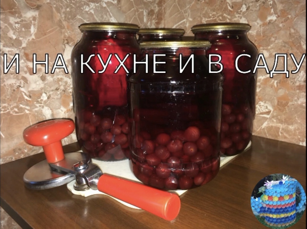 Добрый день, вы на канале И НА КУХНЕ И В САДУ. Сегодня я приготовлю компот из вишни на зиму. Вишню перебираем, моем под проточной водой. Я предварительно простерилизовала 4 банки объёмом 1,5 литра в духовом шкафу 15 минут. Вишню раскладываем по банкам на одну треть. Берём кастрюлю подходящего объёма, наливаем воды приблизительно 6 литров, ставим на плиту и доводим до кипения. Вода в кастрюле закипела, заливаем вишню, чтобы банка не лопнула, ставим её на лезвие ножа. Банки прикрываем крышками и оставляем на 20 - 30 минут до остывания. На банку надеваем специальную крышку и сливаем воду в кастрюлю, так поступаем со всеми банками. Затем в воду добавляем сахар 600 граммов из расчёта на 1 литр воды 100 граммов сахара, в зависимости от сладости вишни количество сахара можно увеличить или уменьшить. Ставим кастрюлю на плиту и доводим до кипения. Сироп закипел, разливаем по банкам. Прикрываем банки крышками, крышки стерилизовались в горячей воде 5 минут. Крышки закручиваем /закатываем/. Пер