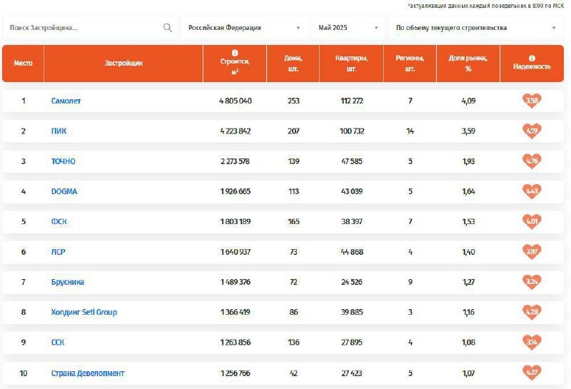Две картинки, первая топ застройщиков по объемам строящегося жилья по состоянию на май 2025, вторая топ по продажам за январь-май 2025 и