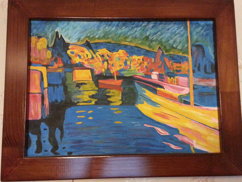 Как-то задали дочке в художественной школе сделать копию одной знаменитой картины. Обычная практика, когда ученики, копируя великих, набираются опыта. И вот решил попробовать сам. К этой работе смастерил простенькую рамочку и подарил родителям жены. Им понравилось... Гуашь, оргалит, размер 300 × 400 миллиметров. А вот оригинал Кандинского, Осенний пейзаж с лодками, 1908 год.