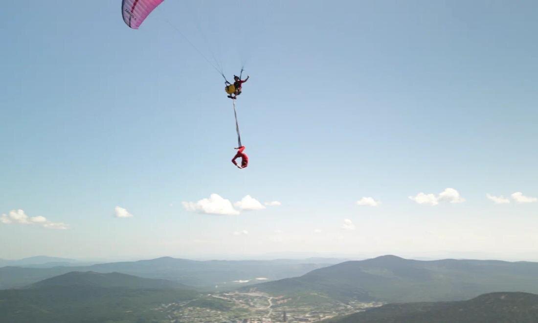 В понедельник, 23 июня, парапланерист из Новосибирска Александр Орлов и 8-кратная чемпионка мира по воздушной гимнастике Анжела Кулагина совершили экстремальный полёт в Шерегеше. Пока мужчина управлял воздушным судном, гимнастка выполняла сложнейшие элементы без страховки.