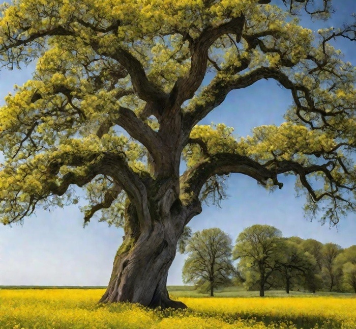 Растёт по правую сторону дуб. А вокруг - зелёная роща из его детей, внуков. А по левую сторону - один только дуб растёт, но зато такой кряжистый, красивый. Любуется своим отражением в реке.