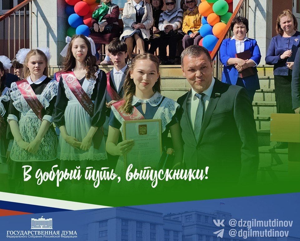 Добро пожаловать в новую жизнь, дорогие выпускники! Ваши школьные знания откроют перед вами новые горизонты и возможности. Найдите своё призвание и реализуйте свой потенциал. Стройте амбициозные планы и достигайте целей. Пусть ваши близкие гордятся вашими успехами! Уверен, что любовь к нашей великой Родине поможет вам стать её значимой частью. Не забывайте о тех, кто вложил в вас силы и знания. Учителя, после родителей, оказали огромное влияние на ваше становление, развили важные качества и дали необходимые навыки. Помните, что вы — будущее Башкортостана и России! Если будете продолжать учебу за пределами республики, возвращайтесь домой, чтобы внести свой вклад в её развитие и развитие Российской Федерации. С окончанием школы, дорогие юноши и девушки, в добрый путь! #динаргильмутдинов #Госдума #ЕдинаяРоссия ЕР Госдума восьмойсозыв