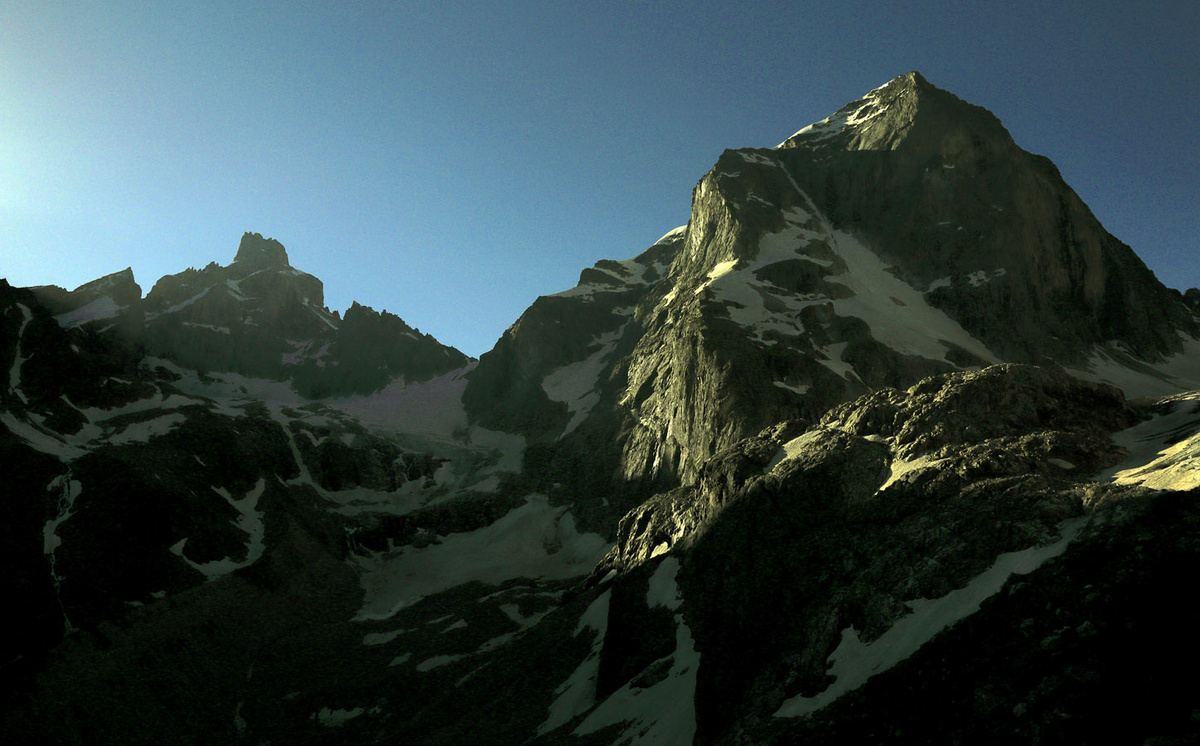 Главной прелестью при подъеме на перевал было то, что лед кончился, а последние метров 50 по вертикали представляли собой крутой склон покрытый мелкой осыпью (и не только мелкой), разъезжающейся под ногами. Но это дело было вполне преодолимым и в итоге группа собралась на перевале. Собственно перевал представлял собой достаточно узкий гребень, примыкающий к главной вершине района Гвандре. С западной стороны ледник доходит до самого перевала. Но нам туда не нужно было
