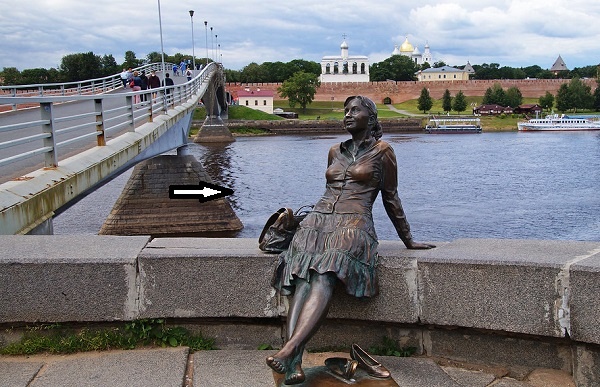 Приметой прошлого тура в Великом Новгороде была скульптура уставшей туристки. Девушка, находившаяся по улицам старинного города, которые полны чудесных достопримечательностей, присела отдохнуть на парапете у Кремлёвского пешеходного моста через реку Волхов. Такой и запечатлел ее скульптор, усталой, но счастливой и полной впечатлений. Сброшены туфельки, чтобы подышали натруженные ноги, фигура девушки полна непосредственности и обаяния. Поэтому «Уставшая» полюбилась новгородцам (зимой они даже повязывают ей шарфики, чтобы не замерзла), ну а гости города видят в ней свою коллегу по туристическим экскурсиям. Кстати, о туфельках… Вандалы покушались на ее обувь, так что одно время она, словно Золушка, ожидала свою туфельку. В общем, замечательная, очень теплая и человеческая скульптура. Самое первое смс с правильным ответом пришло из Новосибирска от медсестры Снегиревской детской поликлиники Веры Доценко. Поздравляем Веру с победой и пополнением счета ее телефона. Очередной тур квеста прой