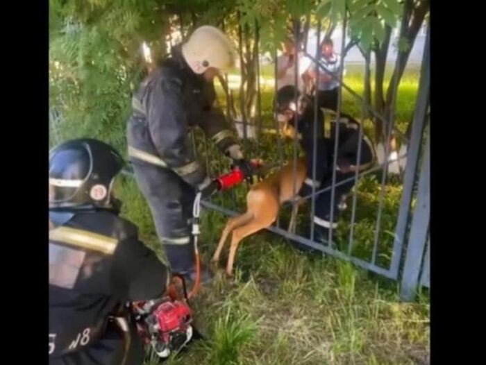 Новосибирские спасатели вызволили косулю, застрявшую между прутьями забора в Первомайском районе.
