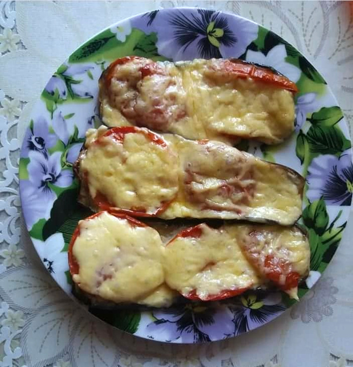 ✔ Баклажаны – 2 средних (500-600 г); ✔ Помидоры – 2 шт.; ✔ Твёрдый сыр («Российский») – 100 г; ✔ Чеснок – 2 зубчика; ✔ Домашний майонез (или густой йогурт/сметана 15-20%) – 100 г; ✔ Соль – 2 ч. л. (для вымачивания); ✔ Растительное масло – 1 ст. л. (для смазывания коврика); ✔ Чёрный перец, сушёные травы – по вкусу. Баклажаны нарезала пластинками и посолила хорошо. Постояли с полчасика, чтобы ушла горечь. Хорошо промыла в воде, отжала и отправила на противень, на тефлоновый коврик, смазав их натертым чесноком. Затем смазала домашним майонезом (можно густым йогуртом или сметаной), и сверху положила кружочки помидора. Отправила в разогретую до 220 ° духовку на 30 минут. Затем посыпала тёртым сыром (у меня «Российский») и поставила снова в духовку на 15 минут. Но смотрите по работе своей духовки. Баклажаны не были сухими, сырыми или подгоревшими. Консистенция мягкая и нежная, с приятным чесночным вкусом, слабосолёные, а помидоры дали кислинку, Сыр хорошо расплавился и дополнил вкус блюда. К