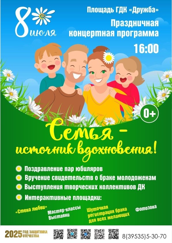 🌼 8 июля в нашей стране празднуют День семьи, любви и верности. 💫 Творческая команда Дворца культуры «Дружба» подготовила для устьилицев праздничную концертную программу «Семья - источник вдохновения». 💑 Вас ждут музыкальные выступления творческих коллективов ДК, поздравление пар-юбиляров, вручение свидетельств о браке молодоженам и шуточная церемония бракосочетания. 💃 На интерактивных площадках будет возможность принять участие в увлекательных конкурсах и викторинах, направленных на развитие семейной дружбы и добрых чувств, а также посетить выставки и мастер-классы, сфотографироваться у праздничной фотозоны. 🕔 Приходите 8 июля в 16 часов на площадь ГДК «Дружба» и проведите незабываемый день, наполненный радостью, улыбками и теплом семейного очага!
