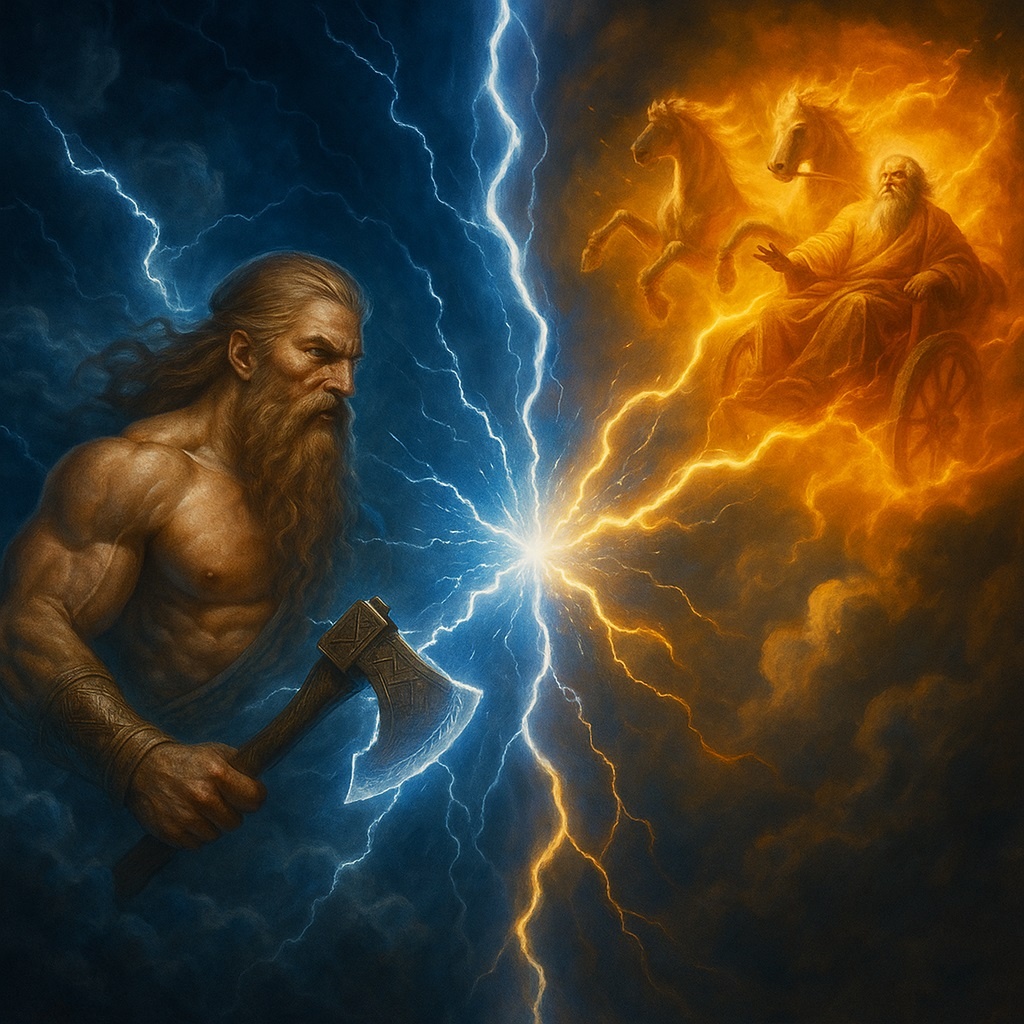 Июльская гроза в селе, что затерялось между Владимиром и Рязанью. Старики крестятся и шепчут: «Илья по небесам катается». Молодёжь на фестивале родноверов кричит: «Перун хлещет!». Бах — и над одной и той же дубравой сверкнуло два имени-молота. Славянский громовержец и библейский огнепророк превратились в идеологических близнецов: каждый топчет тучи, раздаёт искры, любит дуб и уважает меч. Но если Перуна крещение Руси официально «свергло», почему его всё ещё зовут, когда небо трескается? И если Илья победил, почему его праздник звучит языческими бардами? Пришло время взвесить: чей гром громче сегодня — Перуна или Ильи?