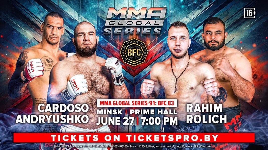 Результаты MMA Global Series 91 • Димитрий Андрюшко 🇷🇺 победил Вадима Ролича 🇧🇾 удушающим приёмом 3 раунд (2:15) • Дмитрий Засинец 🇧🇾 победил Аримарселя Сантоса 🇧🇷 единогласным решением • Савелий Курочкин 🇷🇺 победил Мирзатиллу Эгамназарова 🇺🇿 единогласным решением • Андрей Медюн 🇧🇾 победил Максима Клышко 🇧🇾 ТКО 1 раунд (1:44) • Андрей Василенко 🇷🇺 победил Михаила Бондаря 🇧🇾 удушающим приёмом 1 раунд (3:37) • Ахмед Хотак 🇦🇫 победил Сайгида Зиракова 🇷🇺 болевым приёмом «кимура» 1 раунд (1:26) • Тьяго Кардосо 🇧🇷 победил Буграхана Алпарслана 🇹🇷 болевым приёмом 1 раунд (1:56) • Иван Сырбу-Соловьё🇷🇺 победил Рената Гулевича 🇧🇾 удушающим приёмом 1 раунд (0:52) • ВладислаПальчико🇷🇺 победил Насратуллу Ахондзаду 🇦🇫 ТКО после 1 раунда (отказ угла) • Ислам Мирзагасано🇷🇺 победил Ростислава Якушева 🇧🇾 КО 1 раунд (4:00) • Эдуард Куцко 🇧🇾 победил Александра Барковского 🇧🇾 ТКО 1 раунд (0:34) • Даниил Кулицкий 🇧🇾 победил Богдана Богданова 🇧🇾 ТКО 1 раунд (3: