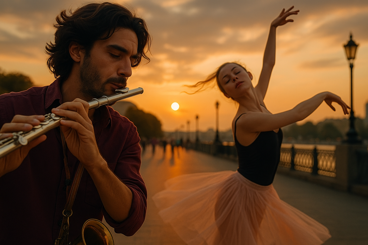 Тем вечером, закутавшись в тёплый шарф, Алина вышла на набережную. Листья шуршали под ногами, фонари отбрасывали длинные тени на мокрый асфальт. Её шаг был медленным, будто она искала в этом городе хоть что-то, что вернёт ей ускользающую себя. И вдруг — музыка. Воздушная, как дыхание ветра. Она остановилась, зачарованная. Мужчина с флейтой стоял у перил, глаза его были закрыты, пальцы порхали по инструменту с лёгкостью, будто сам воздух подсказывал мелодию. Это был Лука. Люди шли мимо, кто-то кидал монеты, кто-то останавливался на минуту. Алина стояла, не в силах уйти.