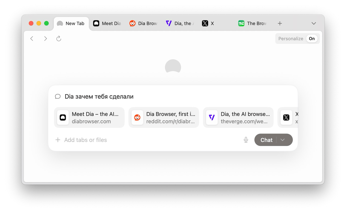 Протестировали новый браузер Dia от Browser Company в модном нынче направлении «AI-first», то бишь делающий ставку на взаимодействие со встроенным искусственным интеллектом. Ещё и слоган такой необычный – «общайся со своими вкладками». Сменили IP-адрес на забугорный (а без этого он не работает) и пообщались. Чем Dia отличается от обычного браузера? Вопрос философский, но если смотреть на функции – в адресной строке и боковой панели поселился ChatGPT, и браузер сам решает, когда запрос нужно обработать в обычном поиске от Google, а когда – ответить с помощью ИИ. Также он умеет при ответе, если попросите, учитывать контекст с открытых вкладок. Очень похоже на функцию «Спросить по странице», которая недавно появилась в Яндекс Браузере (только одновременно можно добавить не одну страницу, а несколько). Глобально это ничем не отличается от NotebookLM, ChatGPT или Perplexity, только ссылки здесь не надо копировать, а достаточно просто открыть. Никаких иных функций, агентных инструментов, глу