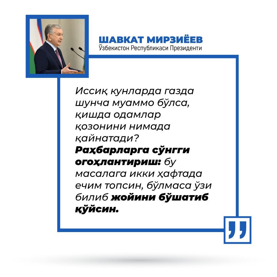 #Иқтибос ⚡️ Газ таъминотида муаммо бўлмаслиги керак. 🔥 «Иссиқ куннларда газда шунча муаммо бўлса, қишда одамлар қозонини нимада қайнатади? ✅ Раҳбарларга сўнгги огоҳлантириш: масалага икки ҳафтада ечим топсин. Бўлмаса, ўзи билиб жойини бўшатиб қўйсин». Шавкат Мирзиёев, Ўзбекистон Республикаси Президенти. Каналимизга обуна бўлинг ва энг сўнгги янгиликларни кузатиб боринг Jizzaxnews |Тelegram | Facebook | Dzen | YouTubе